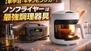 車中泊やキャンピングカーやキャンピングカーで使えるノンフライヤーの実体験レビュー。650W省電力モデルの使用感、電子レンジとの違い、失敗しない選び方のポイントを徹底解説します。